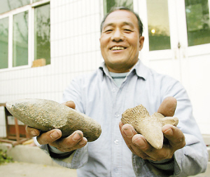 昨日平山县王小波反映,该县温塘镇杨树湾村村民赵玉谱收藏了一把疑似是新石器时代的石斧及一些不明年代的陶器残片和大型动物化石碎片。记者随后会同平山县博物馆馆长李永生,前往杨树湾村一探究竟。