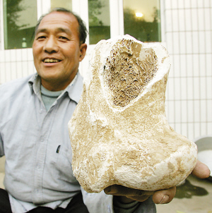 随后,赵玉谱又从屋里捧出一个十七八厘米高、十四五厘米宽,十二三厘米厚的动物骨骼关节化石,骨骼关节有一个直径约5厘米的骨髓孔洞。