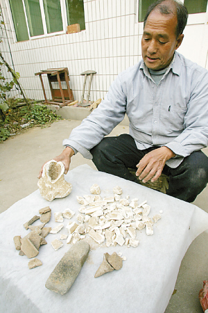 赵玉谱家在杨树湾村村东,听说要看他的收藏,50多岁的赵玉谱拿出两个塑料袋。一个里面装了一百多块大大小小的动物骨骼化石碎片,一个袋子里是50多片陶器残片,随后他又从屋里拿出一块类似石斧的石头。