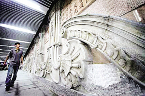 近期关于艺术品进地铁的话题是随着北京地铁4号线的开通而逐渐热起来的。于9月底通车的北京地铁4号线在8个重点站设置了装饰性艺术壁画,其“记忆历史文脉,彰显城市文化,突出地域标志”的设计理念使这些壁画充满了人文气息和历史厚重感。如国家图书馆站的主题为“书的海洋”,圆明园站的西洋楼残柱浮雕,西单站的《老字号》浮雕等。可以看出地铁经营方对引入公共艺术的重视,以及通过艺术品来装饰地铁空间,使乘客得到美的熏陶,甚至提高民众的艺术欣赏水平的愿望。