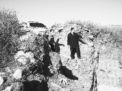 在大青山山顶,秦汉长城烽火台岿然屹立。但是,采矿的井架就在不远处,“矿区重地,闲人免进”的牌子十分醒目。几个10米深的矿坑把沿山而上的秦汉长城拦腰截成两段,南北大约被挖断100米。