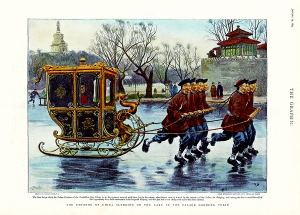 光绪帝北海坐冰橇 光绪皇帝是中国历史上最失意的皇帝之一,一生都被慈禧太后操纵。不过在他人生中也有快乐的时光。1895年冬天,光绪帝曾在北海太液池上坐着冰橇,享受冬趣。世界艺术馆 提供