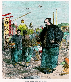 老北京“提笼架鸟” 发表于1873年(同治十二年)的一幅风俗图像,极为生动地描绘了当年的北京人遛鸟的景象。北京人所谓的“提笼架鸟”,实际上指的是针对不同种类的鸟采用的两种不同的饲养和调教方式。世界艺术馆 提供