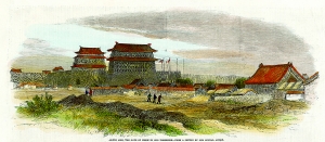 消失的安定门城楼 1861年,《伦敦新闻画报》刊登了一幅具有强烈时代烙印的安定门版画,城门上插着英法联军的旗帜。而在前一年9月,英法联军就是从这里侵入北京城。1915年,北洋政府拆除了安定门的瓮城。1969年,由于修建地铁,安定门城和箭楼都被拆除。