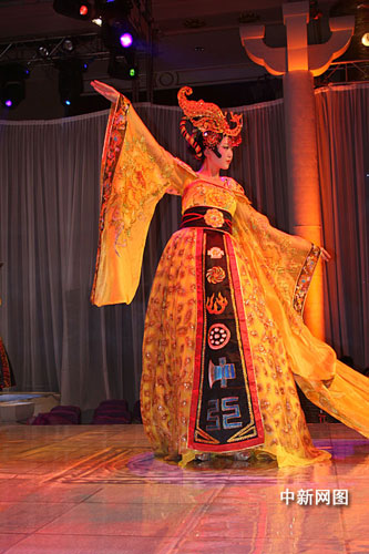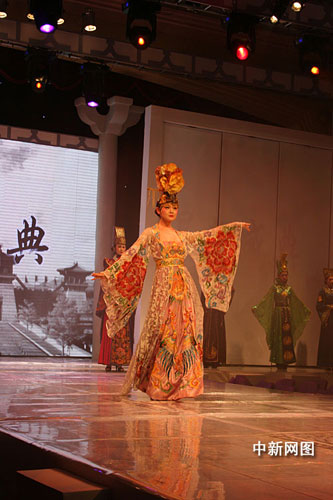 中新网11月24日电(蒲波) “唐风雅韵,魂兮归来!”唐代服秀——《日月大明宫》23日晚在北京展览馆首演。琵琶、锣鼓、二胡等头饰别出心裁,绫罗绸缎搭配精美绝伦的刺绣绚烂多姿,陕西皮影和电子背景有机融合再现大唐气韵。
