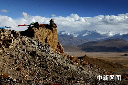 岗嘎镇党委书记达瓦次仁告诉我们,这座山名为“岗嘎山”。在山顶,碎石遍布,但还能清晰地看出关帝庙墙脚的走向。山头悬崖处,是藏民摆放的玛尼堆,还有迎风飞舞的五彩经幡。放眼望去,几十公里外,就是绵延不断的珠穆朗玛群峰。