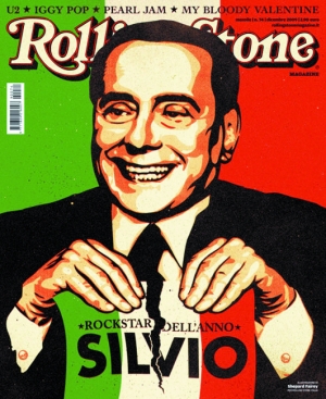 在这期《滚石》杂志(12月号)封面上赫然印着艺术化了的贝卢斯科尼微笑肖像,其背后是意大利国旗,手中则拿着撕裂的意大利国旗。《滚石》杂志意大利版编辑卡洛·安东内利(Carlo Antonelli)称,这位73岁的媒体大亨是由杂志编辑们一致推选成为“年度摇滚之星”的,他说:“今年大家的意见都很一致,他有明显的优势,他的生活用‘摇滚’二字来形容都不够。”
