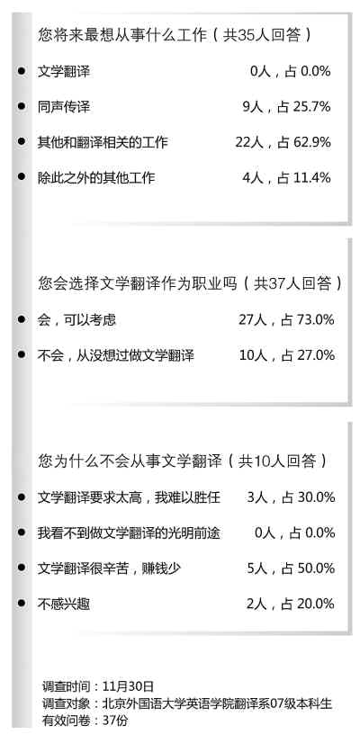 记者对北京外国语大学英语学院首届翻译系学生进行了职业意愿调查,结果却不容乐观:这批“明天的翻译家”们,把文学翻译作为“第一职业”选择的,几乎为零。