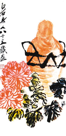 齐白石以花鸟画见长,他善于将民间艺术的审美情趣融进传统文人画,以质朴率真之气开创了文人画的新境界,画面洋溢着活泼的生命力,极具明朗、清新之美,充满了泥土的芳香。技法上,他注重用笔的苍劲老辣与方折劲挺,笔力雄健,挥写自如;墨法则讲究单纯准确,对干湿浓淡的搭配关系极力经营;用色则大胆而浓艳,吸收民间美术的敷色特点,却艳而不俗;构图上,他多以简洁之图,塑花、鸟稚拙之美,但一些作品则极力刻画蝉、蝶、蟋蟀等小昆虫,写实程度足可乱真,与大写意花卉相配,别具情趣。