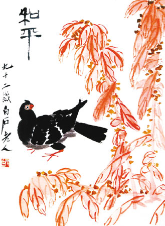 《和平鸽》是一幅以动物为主体的上乘之作。齐白石一生对生活充满热爱,其笔下花鸟虫鱼,乃至蝉、蝶、蟋蟀等小昆虫,皆充满情趣,寄托和凝聚着他内心的天真与童趣。鸽子是白石老人很喜爱的题材,他曾亲自饲养鸽子,观察其体态神韵,创作态度严谨。该画右侧是一丛鲜艳的雁来红,两株并立,一株斜插,枝叶披纷,繁而不乱。在红花之下,站立着一只通体漆黑、红嘴红爪的和平鸽,双目圆睁,回首眺望,极显精神。鸽子虽是大写意画法,但结构造型精准。此画仅黑红二色,却营造了热烈而稳重的氛围。题款“和平、九十二岁白石老人”不仅点明主题,而且在全画以“面”为主的构图中,制造了“点、线”元素,使作品形式更为丰富。