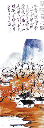 白石老人以花鸟创作为主,但也偶作山水,并能把花鸟画的一些技法运用到山水画中,别有清新明快之感。《罗浮觅句图》是一幅精彩的山水画作品,此作取全景式构图,布局宏大:远处罗浮山巍峨耸立,设色单纯明快,虚实相映,凸显空间之感;山下赭色的坡地上则是梅林如海,白梅绽放,梅香阵阵;林中屋舍隐显,高士携童觅诗;近景水波微澜,渡头空旷,具有浓郁的文人情怀。该画的技法简捷,没有传统山水画的“勾、皴、染、点”的繁复创作程式,而是以大写意手法纵笔平涂,别具简约质朴的生活情趣。在色彩上,大片泥土的赭石红,也与远山浅蓝绿的花青色形成鲜明对比,显得非常精神。题诗“风寒冬深无梦来,相寻曾记那年栽;定是罗浮旧蜨仙,万千如雪向我开”,诗画相配,令人心驰。
