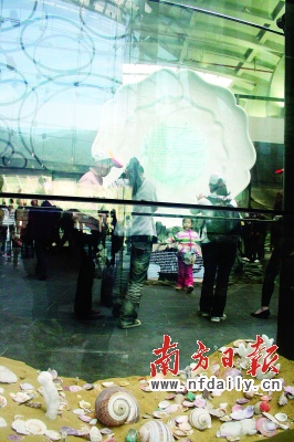 在精品展区的一侧,展馆还特别布置了“水下考古”的专业展览,在类似于海底世界一样的展馆中,脚下玻璃下面是散步的海螺,两侧则是水下考古的相关图片、文字介绍,“水下考古模特”吸引了大量游客合影留念。