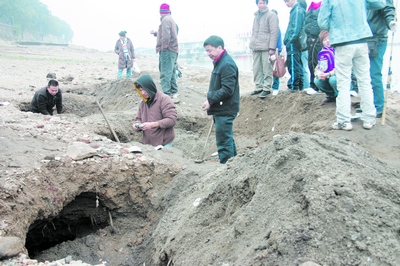 记者近日赶到湘江风光带,在橘子洲大桥南约100米左右的河床上看到,有10多人正在河床上挖洞,几十个洞露在河床上,多数有一两米深。他们有的手持锄头,有的使用砌刀,或三两个人挖一个洞,或者独自挖一个洞。旁边摆放着几个或破损或完整的瓷碗陶罐,这些物件就是从河床下挖出来的。见记者拍照,一些正在挖洞寻宝的人连忙用衣服和帽子盖住头。