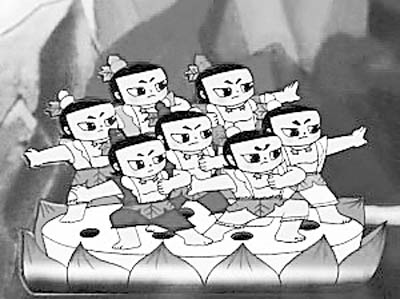 作为一部“剪纸片”,《葫芦兄弟》的拍摄过程就像演皮影戏一样,工作人员需要先把人物剪成有活动关节的纸片,然后在大的背景图案上摆出不同的动作,再一格一格地拍下来。13集的动画片,需要几千个场景,拍摄两年之久。