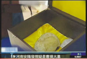“这个墓里,发现石璧三个,圭一个。圭壁合一,是判断一个帝王陵墓等级级别的一个非常重要的标准。”负责挖掘工作的河南省文物考古研究所副研究员、考古队队长潘伟斌说。据介绍,除上述器物外,该墓还出土有大量画像石残块。这批画像石画工精细娴熟,雕刻精美,内容丰富,有“神兽”、“七女复仇”等图案,并刻有“主簿车”、“咸阳令”、“纪梁”、“侍郎”、“宋王车”、“文王十子”等文字,堪称精品。在墓室清理中,发现有人头骨、肢骨等部分遗骨,专家初步鉴定为一男两女3个个体,其中墓主人为男性,年龄在60岁左右,与曹操的卒年66岁相吻合。经研究,认定这座东汉大墓为文献中记载的魏武王曹操高陵。