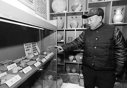 周围村子里有几个砖厂,烧窑就要取土,每次他都等在现场,总会从灰土里找到一些东西,有带着铜锈的刺钩、刻着铭文的瓦当,还有一些用于占卜的骨头。他把自家三开间的东厢房,专门安置收藏的文物供人参观。陶器、瓷器、青铜器,他收藏了有上千件,除了自己捡到的,还有一小部分是他买来的,花钱并不多。