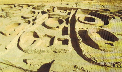 在内蒙古赤峰市二道井子村北部的山坡上,149座青铜时代早期圆形房址,回廊和侧室构成一个个院落,环壕和城墙相连形成统一的斜面,空中俯瞰颇为壮观。这就是2009年4月,内蒙古考古文物研究所为对面积约3万平方米的夏家店下层文化遗址进行抢救性发掘的成果。
