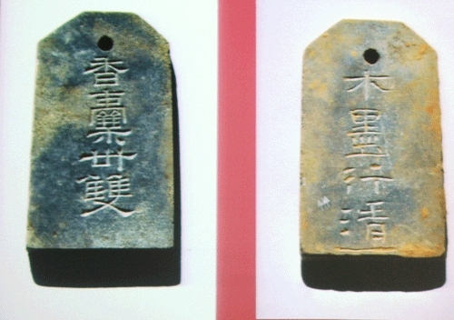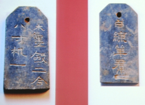 西高穴大墓中的刻铭石牌有59块,从器形上看可以分为两大类。一类为圭形,长10.8厘米,宽3.1厘米,厚0.8厘米,尖部中间有穿孔,孔内有铜环,铜环连以铜链。上面刻有“魏武王常所用挌虎大戟”“魏武王常所用挌虎短矛”等内容;另一类为六边形,长8.3厘米,宽4.75厘米,厚0.7厘米,上部中间有穿孔。其刻字内容为随葬物品的名称和数量,如衣服类有“黄绫袍锦领袖一”、“丹绡襜襦一”等;用具类有“镜台一”“书案一”“渠枕一”等;其他还有如“香囊卅双”、“胡粉二斤”等。这些石牌上的铭刻绝大多数都是汉隶,俗称“八分体”,字体规整,遒劲有力。只有8块字体为较为潦草的汉隶体。