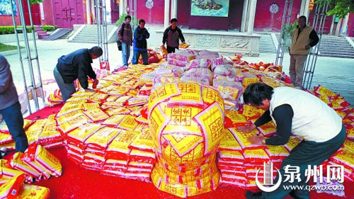 从2007年起,台湾澎湖、泉州两地天后宫便联合在泉州天后宫举行“乞龟祈福”民俗活动,今年已经进入第4年。刚开始,用于制作大“米龟”的大米只有1万多斤。而随着活动的影响一年比一年大,制作大“米龟”的大米也越来越多,今年多达3万斤。活动结束后,用于制作大“米龟”的3万斤“平安米”中的相当一部分,将分发给部分困难户。