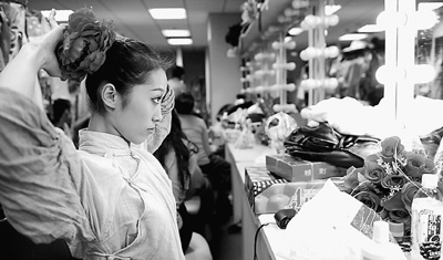 序幕里,周岩扮演的“和谐少女”在舞台上空飞过,造型惊艳,一下子就调动起了观众的情绪。但在第一次吊威亚培训时,她哭了。“为了安全,腰上要系得特别紧。”在天上吊着的时候没有什么感觉,结果脚一着地,“就疼哭了”。