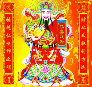 住户家礼拜的多是文财神,亦称增福财神。传说它是北斗七星之一降临到人间的,那财神爷画像上面的白脸长须,左手执玉如意,右手捧个宝盒,上面书写着“招财进宝”字样。