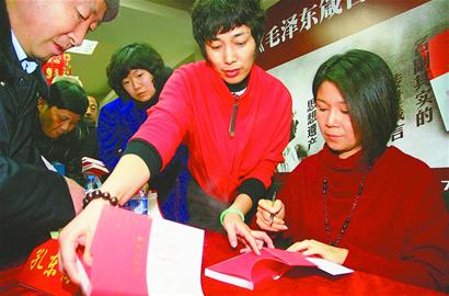 3点30分,签售活动正式开始。人们按照顺序,依次走到签售台前请孔东梅签名,有的人还对其表达着对毛泽东的热爱之情,有的则和她合影留念。