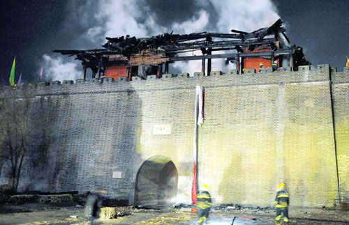 昨日,记者从正定县文物旅游局获悉,目前正定南城门上仿古建筑烧毁严重,游客暂不能登城游览。城门上启功书写的“长乐门”三字匾额已被烧毁。古城砖墙部分并无大碍,上书“三关雄镇”字迹仍在。目前,正定县已将南城门列入计划准备马上重修。