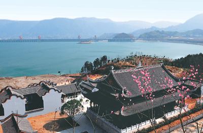 2月19日,迁建湖北省秭归县凤凰山上的屈原祠(前)与三峡大坝遥遥相对。
