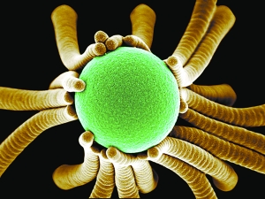 哈佛大学一个工程师团队发现,将聚合物毛浸没在液体中,随后液体蒸发,聚合物毛就会呈现螺旋结构。这张经过数字处理增色的图片显示,聚合物毛形成的螺旋结构直径尽管只有250微米,甚至能够紧紧抓住小球体,需要时也可以将之释放。这一研究展现了控制聚合物毛的新方法。图片是科研人员利用扫描电子显微镜制得的,赢得了图片类第一名。