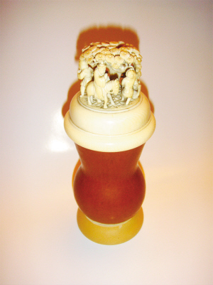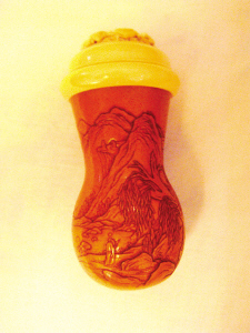 万永强介绍,在清代,“葫芦文化”曾经达到过一个高峰,尤其是宫廷里的将后王爷们,谁都会有几个好葫芦,大家还记得讲述溥仪一生的意大利导演贝尔托鲁齐的电影《末代皇帝》吧,最后一个镜头就是年老的溥仪回到故宫,竟神奇般的从当初的皇帝宝座后面掏出了一只蝈蝈葫芦,可见养蝈蝈、玩葫芦已经是当年的一种贵族文化。“只可惜这位意大利名导对葫芦文化也是略知皮毛,溥仪是皇帝,怎么能玩那种葫芦呢?”万永强指了指自己精心收藏的几件工艺精湛的清代葫芦作品讲,“最起码也得够这种级别的吧,这才是宫里的东西呢。”万永强拿起了其中的一件,给记者详细讲解,这件作品不但葫芦器型讲究,有宫廷里的“官器”味道,最主要的是葫芦口上面的象牙“蒙芯”,雕工简直让人称绝——方寸间雕刻了《西游记》中的师徒四人,正在经过一片树林,树林的中间还吊起了一位用绳子捆住的孩童——正是《西游记》中“红孩儿”中的章节,最叫绝的是,轻轻晃动象牙“蒙芯”,吊起的“红孩儿”还会来回活动,原来,中间连接的锁扣被透雕成了活动的,而且人物的五官表情清晰可见,简直令人啧啧称奇。“这件作品是我好多年前从国外买回来的,给王世襄老爷子看过,老爷子很喜欢,说这东西在清朝当时都是绝无仅有的,能玩它的,最起码是个王爷。”万永强讲,“这也难怪意大利的大导演,这些好东西收藏家都难得一见,你让他上哪找去。”
