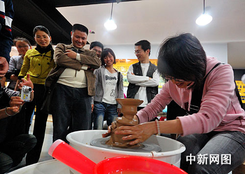 制作现场上,优美动听的古筝乐曲不停地缭绕盈耳,瓷艺家们或捏或雕,或刻或镂,或推或接,各种传统技法纷纷上阵,精彩纷呈。这行云流水般的手法、精妙细致的做工、别出心裁的设计,让参观者看得眼花缭乱,赞叹不已,为之折服。人们忍不住上前摸一摸细腻的瓷泥,转一转工作盘,拿一拿精致的制作工具。前来参观的颜小姐不禁挽起袖子也亲身体验了一回手拉坯。在转盘的带动下,颜小姐双手轻拉瓷泥,那团柔软的瓷泥仿佛有了灵性一般“舞蹈”起来,一会变成一个款嘴的大海碗,一会又变成一个细腰的小花瓶。举着满手的瓷泥,颜小姐开心地说:“太有意思了,让我想起小时候玩泥巴的情景。”她还表示:“下次有空的时候,我一定还要再来玩手拉坯,DIY一件作品做纪念。”
