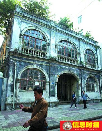 现状:门前的拱形外廊由12根木柱支撑,建筑四周已经被铁栏隔开,成为“禁区”,早在2001年就被定为危房,一直没有修葺。