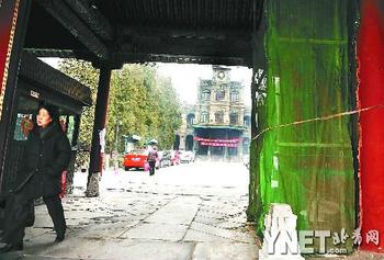 去年10月21日,同样位置一辆轿车驶入院内时,把门口的抱鼓石和大门撞坏。事故发生后,文物部门为了保护被撞的大门,在门外立起了保护性的脚手架,并挂上了绿色的防护网。