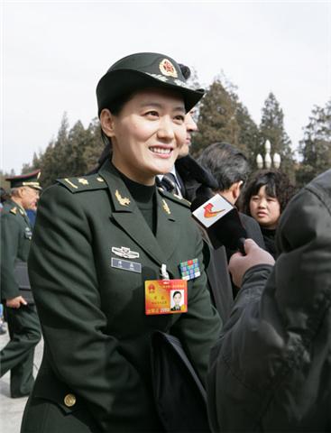 3月8日上午,参加十一届全国人大三次会议的解放军代表谭晶被男记者包围采访。 中新社发 张宇 摄