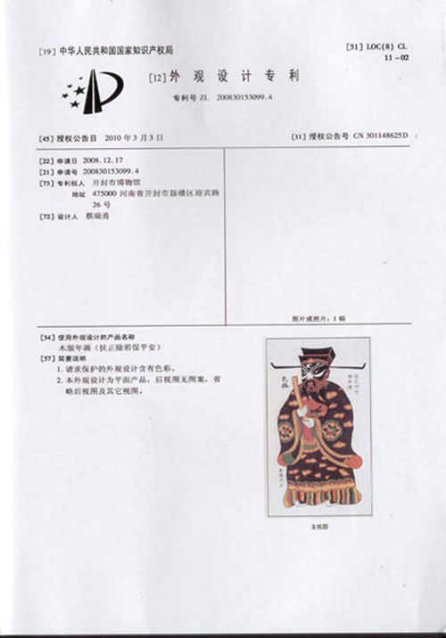 这幅《扶正除邪保平安》专利号为ZL200830153099.4,为河南省非物质文化遗产保护提供了有益启迪。完