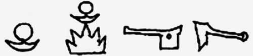 大汶口文化的象形符号,(1)为一团云气托着一轮红日,(2)在(1)下加山形,(3)像斧钺,(4)像锛子。(1)和(2)是自然界的景象,(3)和(4)是人类发明的工具。这些原始文字的取象都是当地先民所熟悉的事物。在近代流行的“三书”架构里(唐兰、陈梦家、裘锡圭都有系统的界说),这些原始文字属于表意字范畴,所描绘的或者是具体事物的形象,或者是生活当中的场景,或者是生活当中的事件,都是“近取诸身,远取诸物”(《说文解字·叙》)的。
