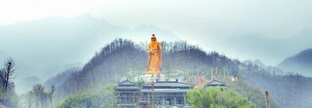 昨日,洛阳栾川老君山上施工人员正在目前全国最高、最大的老子铜像前进行施工扫尾工作。当日,像高38米、通高59米、位于栾川县老君山老子文化苑的老子铜像露出真容。记者陈晓东图
