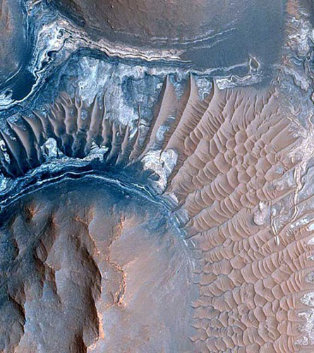 夜迷宫(Noctis Labyrinthus )裸露区以其陡峭的山谷而著称。火星轨道器上的分光计(利用光识别物质成分)读数显示,这里存在含铁的硫酸盐和黏土等矿物质。超高分辨率成像科学实验照相机的观察资料显示,该地裸露的地层可能是火星专用影像光谱仪(CRISM)看到的这些迹象的来源。在子图象中的下方可以看到清晰的分层。在图片的左上方,可以看到覆盖在其他矿床上的连绵沙丘。