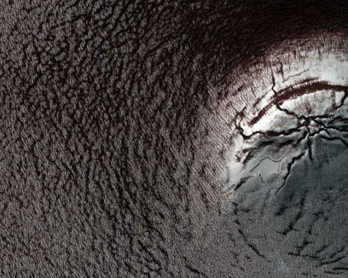 由冰和尘埃构成的一层厚达2英里(3.22公里)的物质,像夹心蛋糕一样堆积在一起,覆盖在火星南极地区。这里形成的撞击陨石坑,例如直径0.5英里(804.67米)的这个,比拥有很多岩石的地区经历了稍微更加缓慢和略微不同的剥蚀过程。
