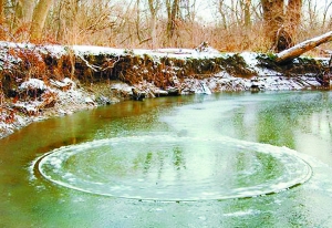 不光麦田有奇特怪圈,水面也有神秘现象:漂亮的正圆形冰圈在水中缓慢旋转。这一奇景还流传着几种不同的理论。最流行的说法是河水缓慢流动会旋成一块圆形的冰,然后随着冰块缓慢旋转,边角相互摩擦,最终形成一个正圆形。这个直径约1.8米的旋转冰圈是在加拿大发现的。