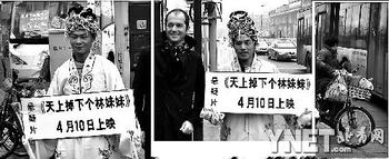 刚走了一个“犀利哥”,又来了两个“林哥哥”。昨日,不少人在北京闹市区发现一道独特的风景,两个身穿古装戏服、头戴古装女式头套,神情忧郁的男子在中关村、王府井、西单等人流量大的地方游走,引发不少人的围观与猜疑。不明真相的群众都被这种装扮惊住,纷纷惊呼“太雷了”,而两个男子手上都举着一块牌子,上面写着“悬疑片《天上掉下个林妹妹》4月10日上映”,很多人都在窃窃私语,是不是电影的宣传噱头,男版的“林妹妹”也不说话,有时忧郁,有时又微笑,还向人群招手,一点都不怯场。记者走上前去询问,才发现他们原来是电影《天上掉下个林妹妹》中的两位群众演员。