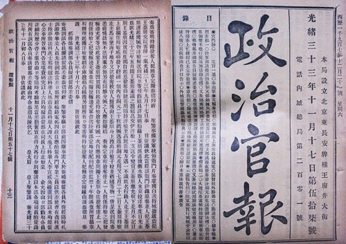 郭志刚介绍,《政治官报》是近代史上第一份由中央政府创办的报纸,光绪皇帝亲笔题写报名,由清政府在1907年7月创刊,被誉为“大清第一报”。这是一份日报,但发行量很小,只有六品以上的文官、五品以上的武官才能“订阅”。而王菳朋的案子则有可能是中国最早的持枪抢劫新闻。 (记者黄珍 通讯员郭璋)