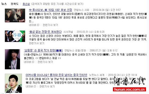 80后作家韩寒入围美国《时代》周刊“全球最具影响力人物”一事尚在激辩当中,近日,有网友在华声、猫扑等论坛发贴称,“韩国人八大证据力证韩寒是韩国人”,成为又一个网络热点话题。这是继孔子、曹操、李时珍、西施、孙中山等中国历史名人“被韩国人”后,又一起“争抢名人”事件,引发中国网友集体声讨。