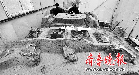 省文物考古研究所所长郑同修介绍,车马坑及马坑等重要遗迹整体起取至济南后,就采取了初步的防护措施,建设了临时保护和工作用房,制定了保护工作方案。