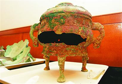 另外,在此次考古发掘的后期,还有相当一部分青铜器出土,但锈蚀、损坏严重,保护非常困难。这些青铜器上有没有铭文还不知道。现在从北京调用的专业 X光机即将到达,届时将给这些青铜器进行X光拍照,看锈的下面是否有铭文,然后再将这些青铜器运到北京,请专业人员进行清理保护。因为还需要深入研究,预计这些带铭文的青铜器将不会在下个月开馆的省博物馆新馆展出。