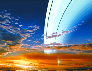 这是太阳系里最壮观的环状结构——土星的对流层。白色的冰环悬浮在7.5万公里的高空,土星环发出的光照亮了周围的一切,亮度不亚于天空升起的6轮新月。正在下落的太阳发出的光线照到氨晶体构成的雾霭上,形成美丽的幻日。时速超过1500公里的氨气云团快速从面前飞过,这是太阳系里速度最快的风。下方是像金属一样的液态氢组成的汪洋。