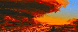 太阳系里最大的反气旋。从这个有利位置放眼望去,只能看到木星大红斑的一小部分。它比周围云层至少高8公里。能量巨大的闪电在更低处的云团里不断闪耀。反气旋外围的风,以每小时超过400公里的速度旋转。木星红斑每7天反向旋转一周。这种巨型风暴产生的涡流非常狂野,发出震耳欲聋的声音,至少在木星的南半球盘旋了400年。有两颗地球大小的行星已适应了这种风暴环境。