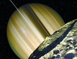 登上土星的卫星——土卫一上的赫歇尔陨石坑的顶峰,将发现自己正站在距离这个陨石坑底部6000多米的地方。这座山峰四周被陨石坑壁环抱,高大约是5000米,位于它背后的土星正在下沉,科学家想弄明白,土卫一在这么强大的撞击之下,是如何幸存下来的。这个陨石坑的直径是139公里,大约是这颗卫星直径的三分之一。