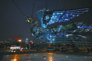 这两只大小相仿的“凤凰”,被一字排开的六台明黄色的大型吊车吊在十多米的高空中,看上去约有30米长的样子,砸土机强悍的顶部构成了凤头,扣上几顶红色安全帽就成了凤冠,破碎的挖土机机械臂充当了脖子,混凝土搅拌机罐则成了凤肚,凤尾是各种建筑钢条,神来之笔是“凤凰”双翅上栩栩如生的片片羽毛——由一个个无柄铁锹整齐地排列而成。