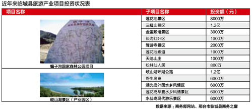之所以这样做,对两地来讲都有几分无奈。临城多年来苦于没有一张城市的文化名片,该县旅游资源丰富,崆山白云洞、天台山、歧山湖、小天池、宋代普利寺塔 、唐代邢窑遗址。旅游产业初具规模,项目投资也很大(见附表),但是,一直缺乏自己的城市名片和旅游品牌,严重制约了当地旅游业的大发展。